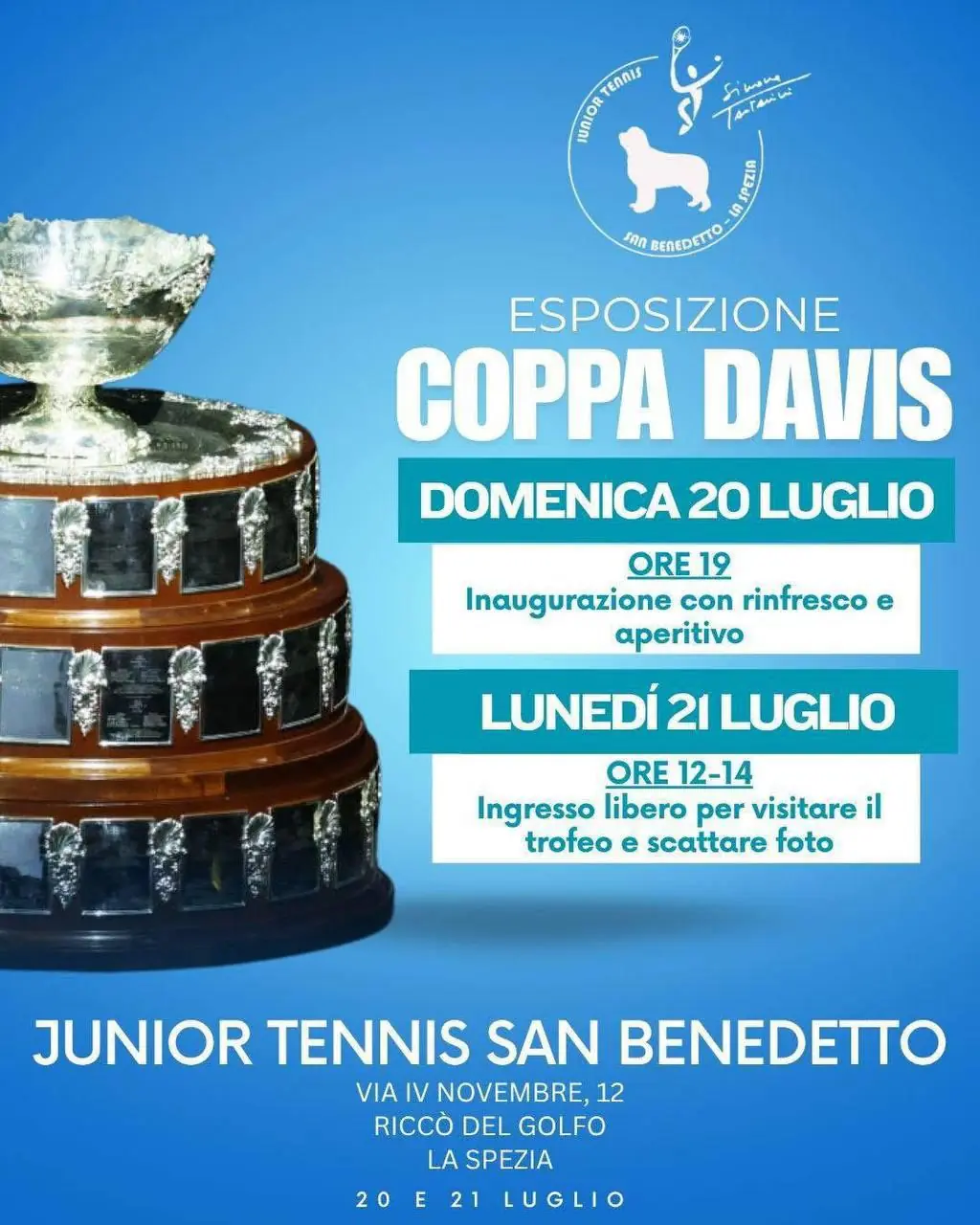 Un evento storico per Riccò del Golfo! Il prestigioso trofeo della Coppa Davis, conquistato dagli Azzurri nelle ultime due edizioni, arriva nel nostro territorio per un'esposizione esclusiva.